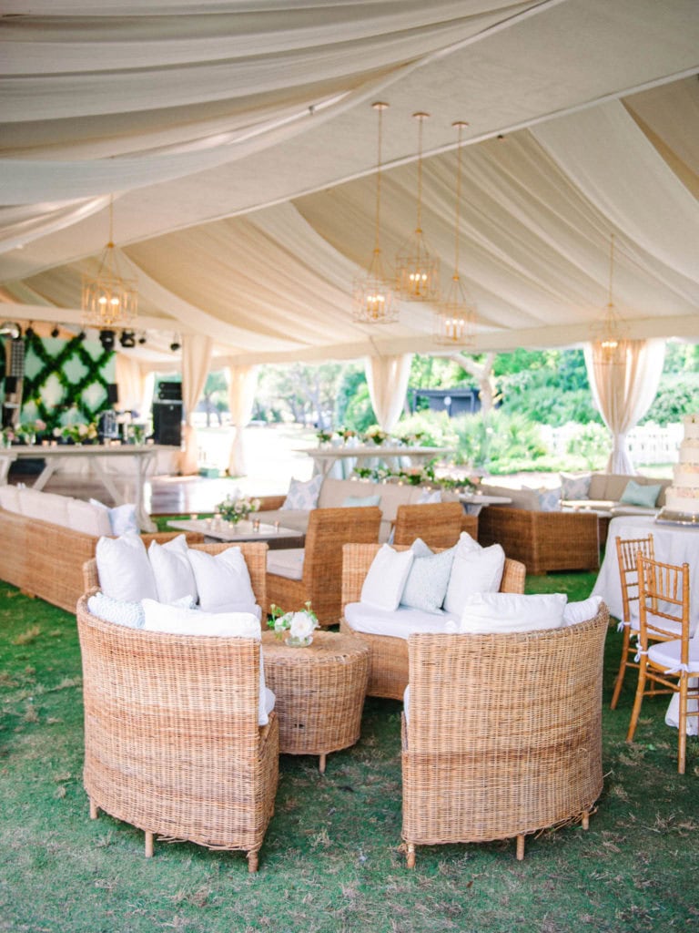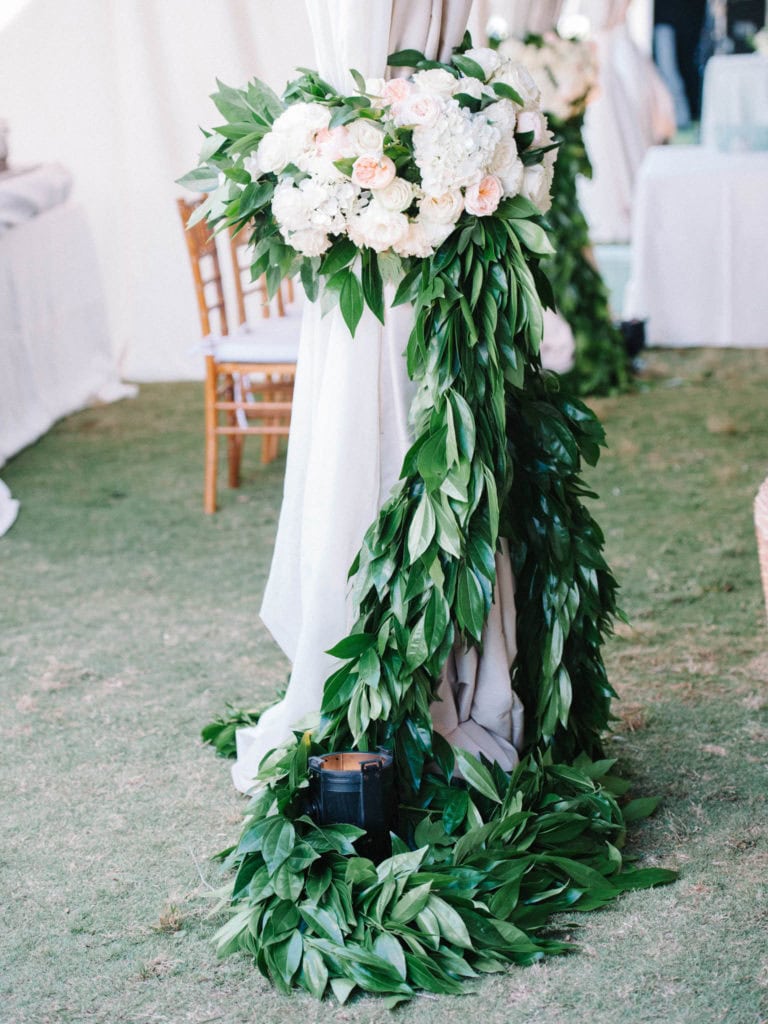 The wedding design balanced coastal simplicity with refined elegance. A palette of white florals, greenery, and gold accents highlighted the natural surroundings. Guests gathered under a clear tent adorned with greenery, soft draping, and candlelit tables — creating a romantic atmosphere beneath the stars.